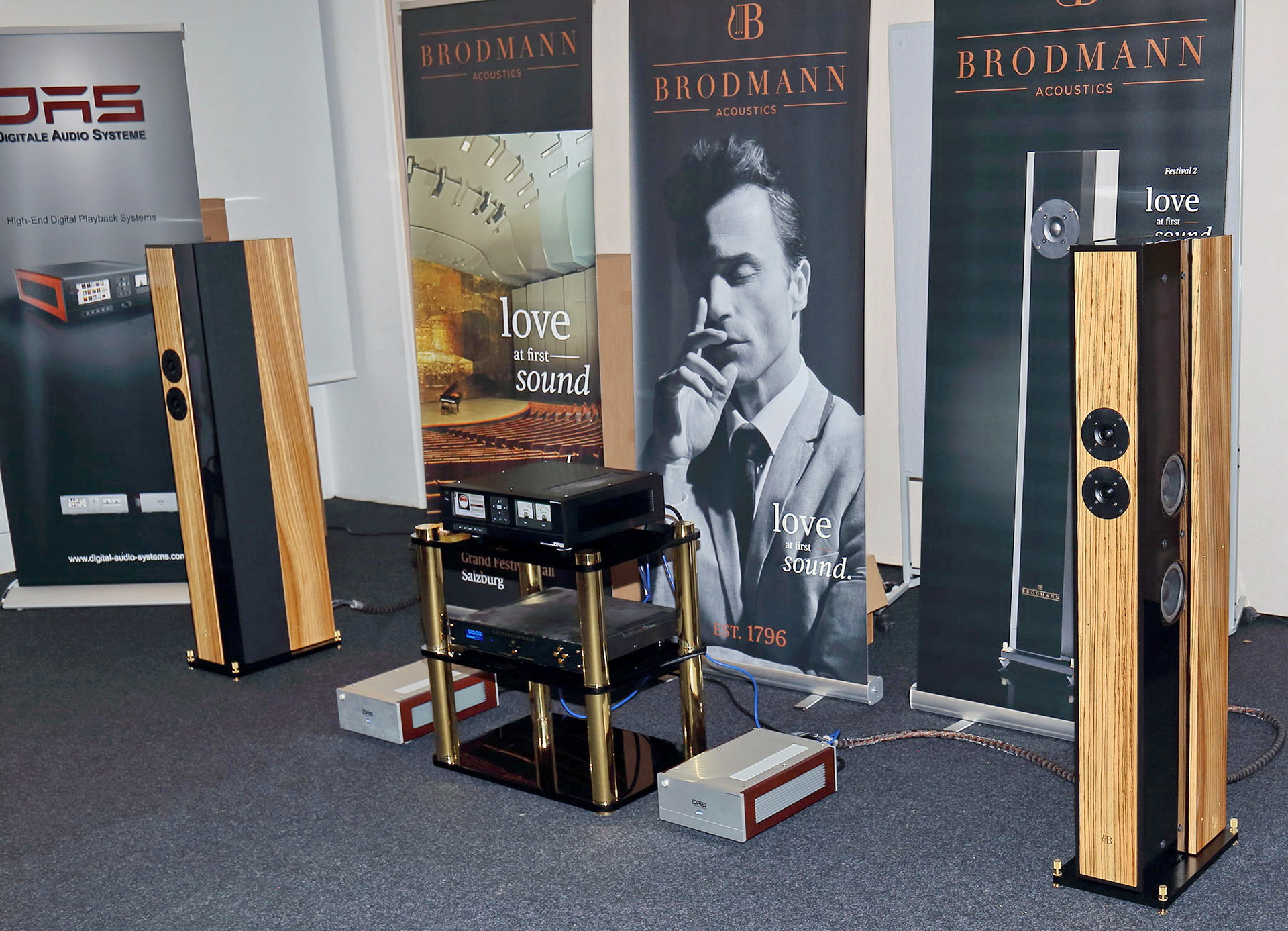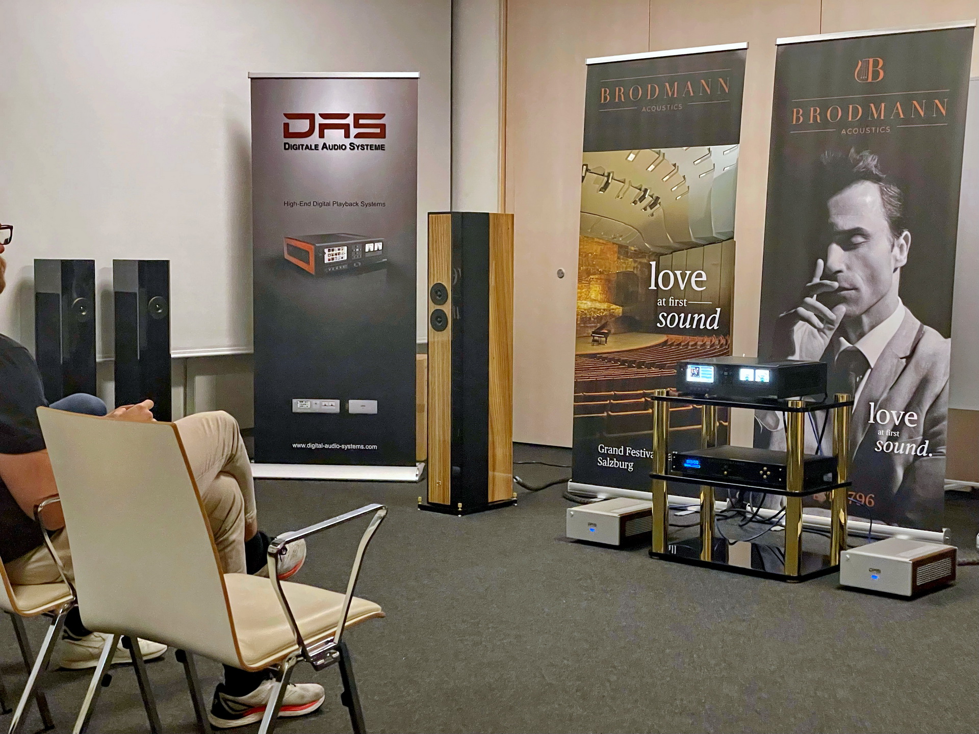 Brodmann konzipiert seine Lautsprecher aus der Klavierbauerhistorie der Firma als wohnsalon-freundliche Klangskulpturen. Das zeigt sich in den makellosen Klavierlackoberflächen ebenso wie in ihrem warmen und natürlichen Klang. Die DAS-Endstufen hatten die Brodmann-Lautsprecher fest im Griff und brachten sie aufs Schönste zum klanglichen Erbblühen. Die analoge Natürlichkeit und stupende Räumlichkeit des DAS Streamers konnten die Brodmann Lautsprecher wunderbar in den Raum transponieren.