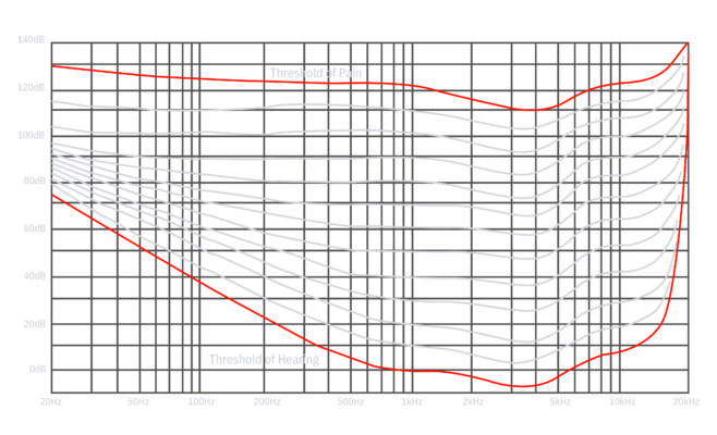 Auf jeder der weißen und roten Linien ist die wahrgenommene Lautstärke für den Bereich 0 – 120 Phon in etwa gleich. Zum Beispiel: Ein 20Hz Ton mit einem Pegel von 95 dB wird so laut empfunden, wie ein 4kHz Ton mit einem Pegel von 45 dB, nämlich beide mit einer Lautstärke 50 Phon.