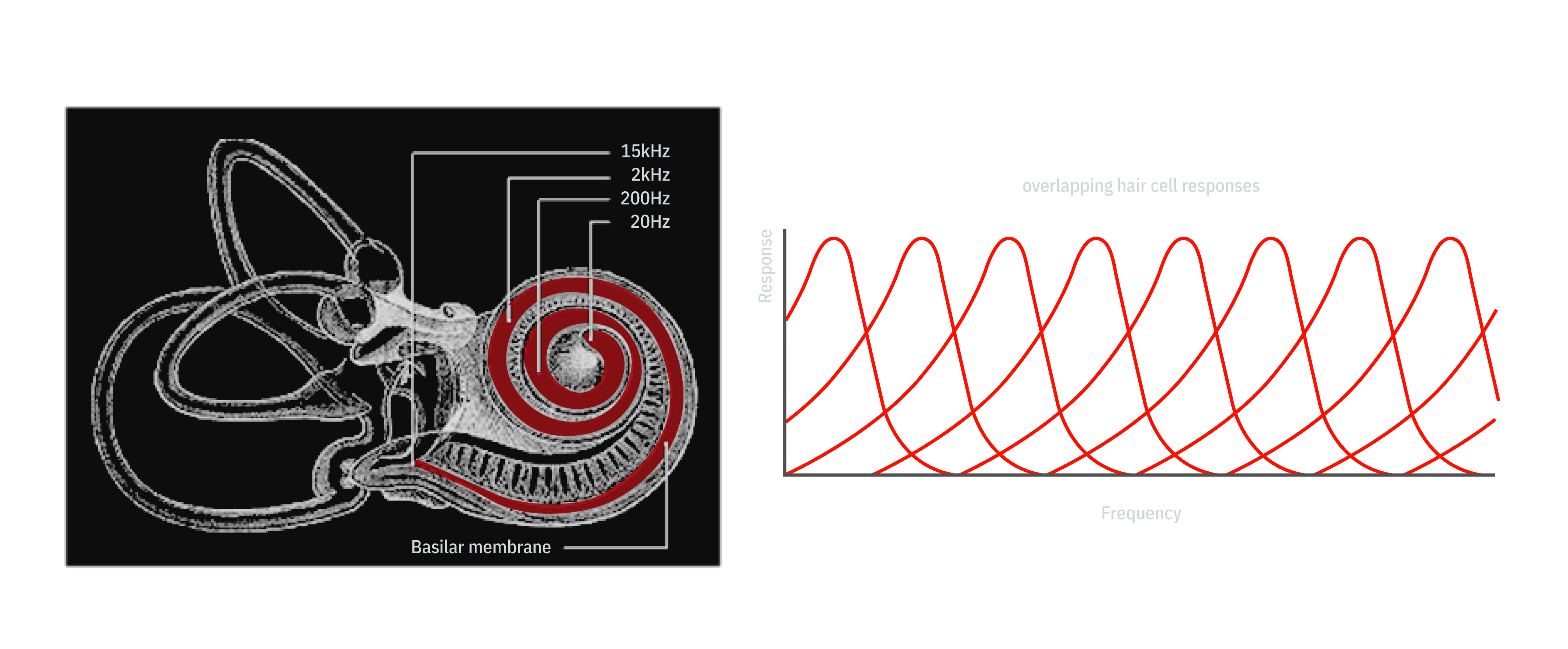 Das menschliche Gehör hört durch vier Reihen von Härchen, die sich in der Basilarmembran innerhalb der Cochlea befinden. Jede Haarzelle ist auf ein schmales Frequenzspektrum, das durch seine Position auf der Membrane bestimmt wird, gestimmt. Da die Basilarmembran am ovalen Fenster schmal und dick ist, ist ihre Eigenfrequenz hier hoch (bei geringer Amplitude), so dass in diesem Bereich hohe Frequenzen wahrgenommen werden. Weiter in Richtung Zentrum der Schnecke (Helicotrema), wo sie breiter und dünner ist, schwingt sie mit niedrigerer Frequenz (bei größerer Amplitude), so dass in diesem Bereich tiefere Frequenzen wahrgenommen werden. Die Empfindlichkeit der jeweiligen Haarzelle hat ihr Maximum in der Mitte des Frequenzspektrums und fällt rasch zu beiden Seiten hin ab, so dass sich die Spektren nebeneinander liegender Härchen überlappen und eine Art überlappender Serie von Frequenzfiltern darstellen.