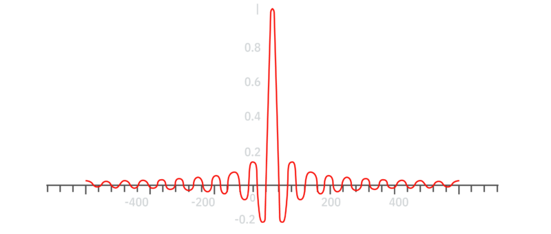 Die digitalen Filter führen allerdings zu einem neuen Phänomen: dem Pre-Ringing, bei dem die Impulsantwort, neben dem Nachschwingen (das es auch bei analogen Filtern auftritt) auch ein unnatürliches Vor-Schwingen (Pre-Ringing) vor dem Eintritt des eigentlichen Signals aufweist, so dass das Filter das Signal über die Zeit “verschmiert”. In den nachfolgenden Graphiken 4 & 5 wird der ursprüngliche Dirac-Impuls mit einer Breite von exakt 1 Sample durch den Filter über viele Samples zeitlich verschmiert. Dieses Phänomen wird hauptsächlich für die teilweise unnatürliche Klangqualität von Digitalaufnahmen (harte Klangtexturen, flache Räumlichkeit, hohe Frequenzen, die gleichzeitig eng und brillant klingen etc.) verantwortlich gemacht: